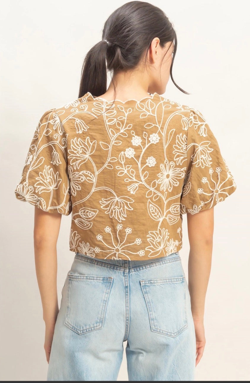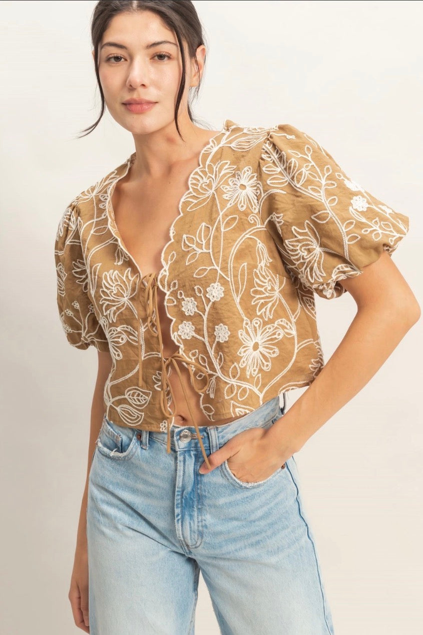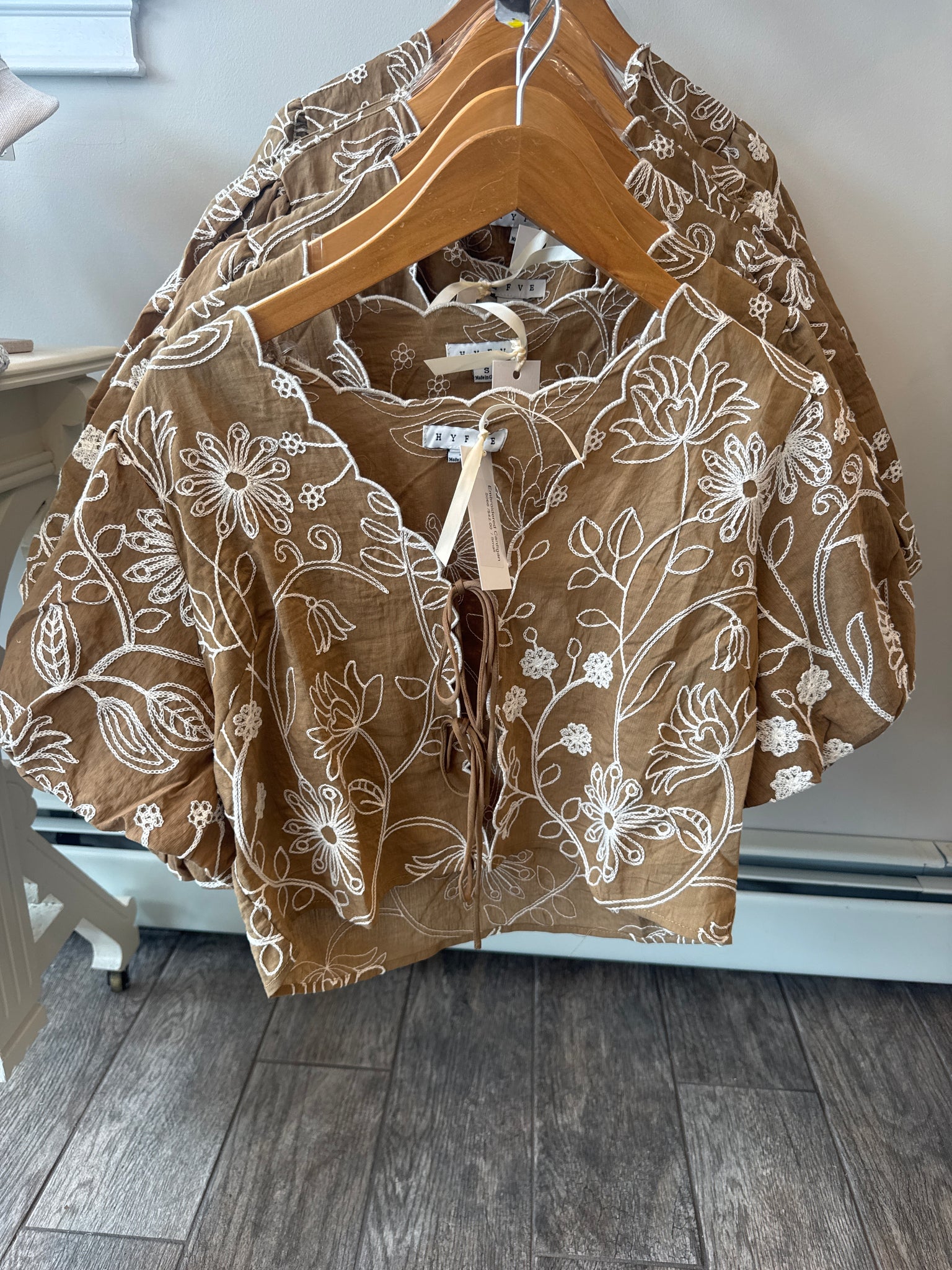 Elevate your everyday style with this charming embroidered cardigan. Featuring delicate light brown and white embroidery detailing, it brings a touch of artisanal elegance to any outfit.