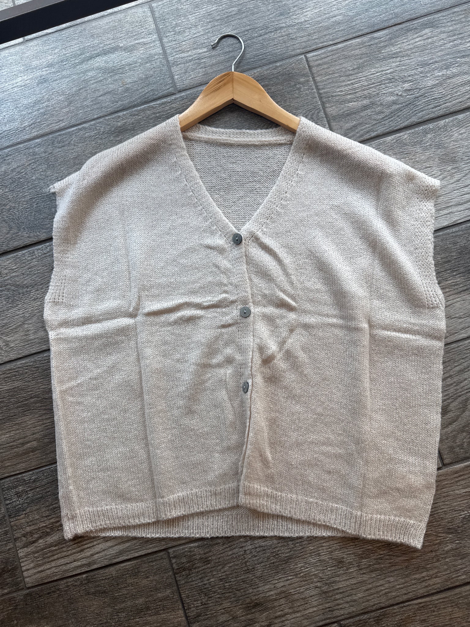 Add a fun twist to your wardrobe with this beige sleeveless cardigan! Perfect for layering, it brings a cozy yet breezy vibe to any outfit. Whether you're dressing up or keeping it casual, this versatile piece adds a playful touch while keeping you comfortably stylish all day long.