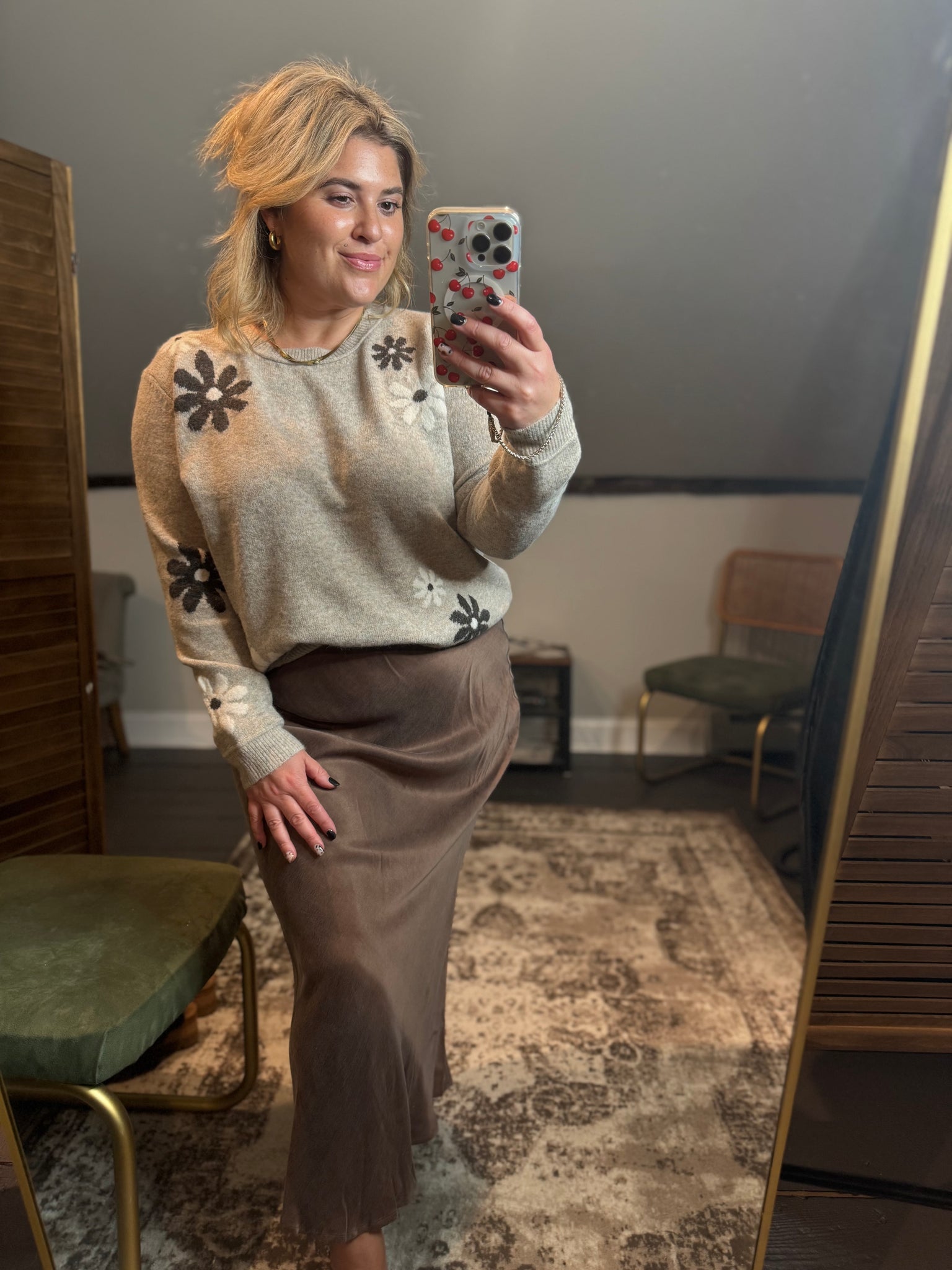 Wrap yourself in warmth and charm with this Wool Blend Sweater. Its soft, cozy fabric feels like a gentle hug, while the delicate floral accent pattern adds a touch of playful elegance. The light mocha color brings a subtle sweetness to your look, perfect for brightening up any chilly day with a smile.